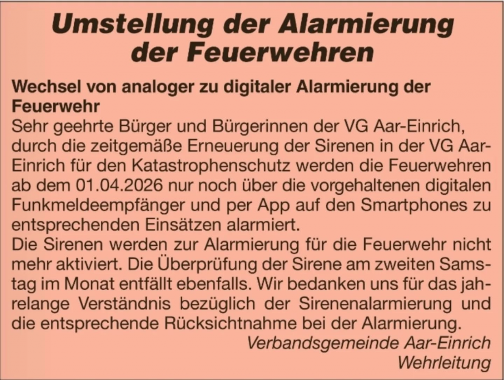 Zum 31.03.2026 endet bei den Feuerwehren der Verbandsgemeinde Aar-Einrich die analoge Alarmierung – und damit auch ein Stück Tradition.